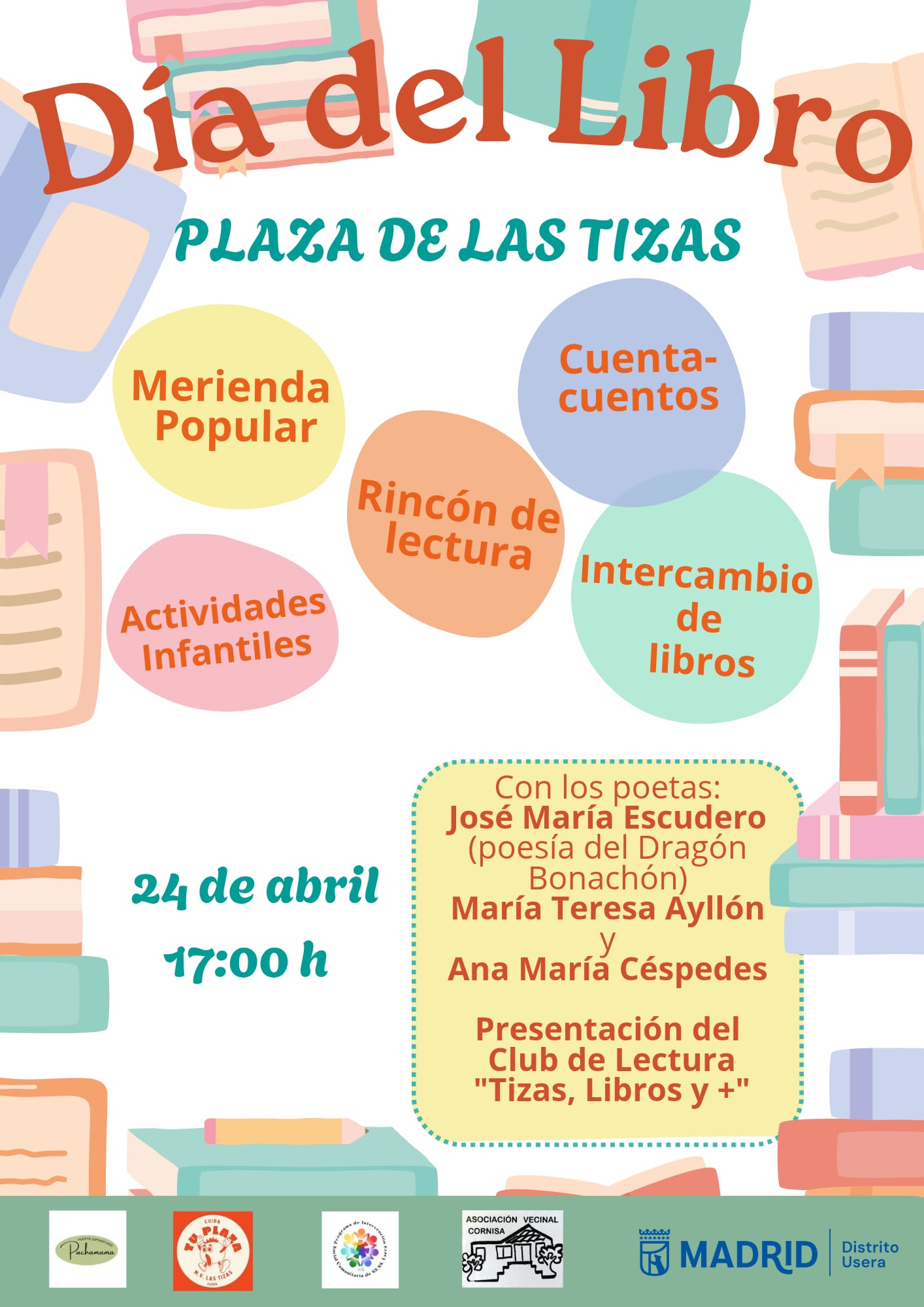 El próximo 24 de abril a las 17 h. nos juntaremos en la Plaza de las Tizas para celebrar el Día del libro. Habrá poesía, rincón de lectura, cuentacuentos, merienda popular y muchas más cosas. ¡Te esperamos!